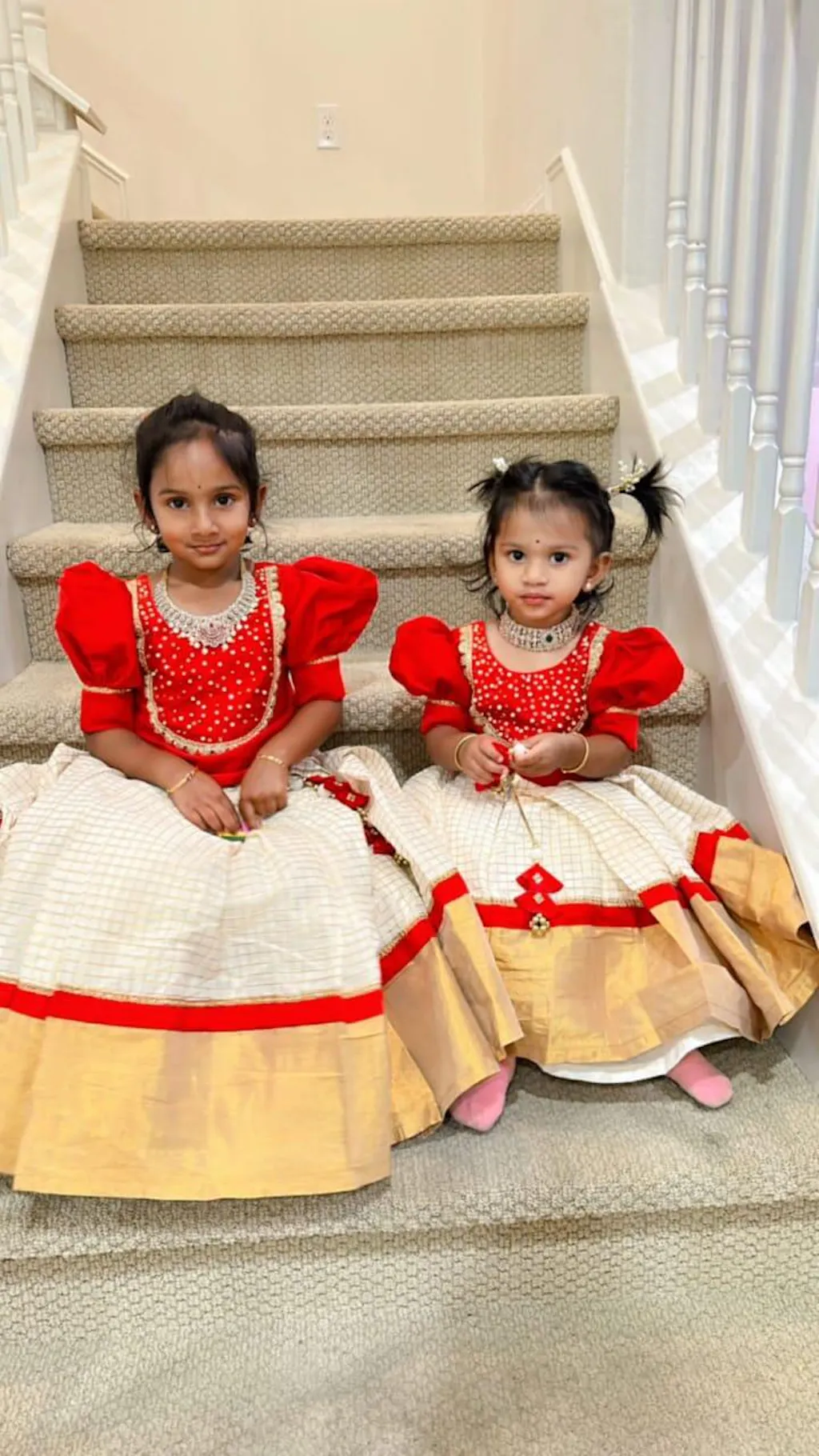 Red top with cute puff sleeve and neck embellishment work. Bottom - Checked kerala kasavu pleated skirt with handmade tassels.